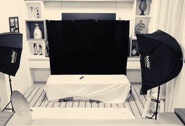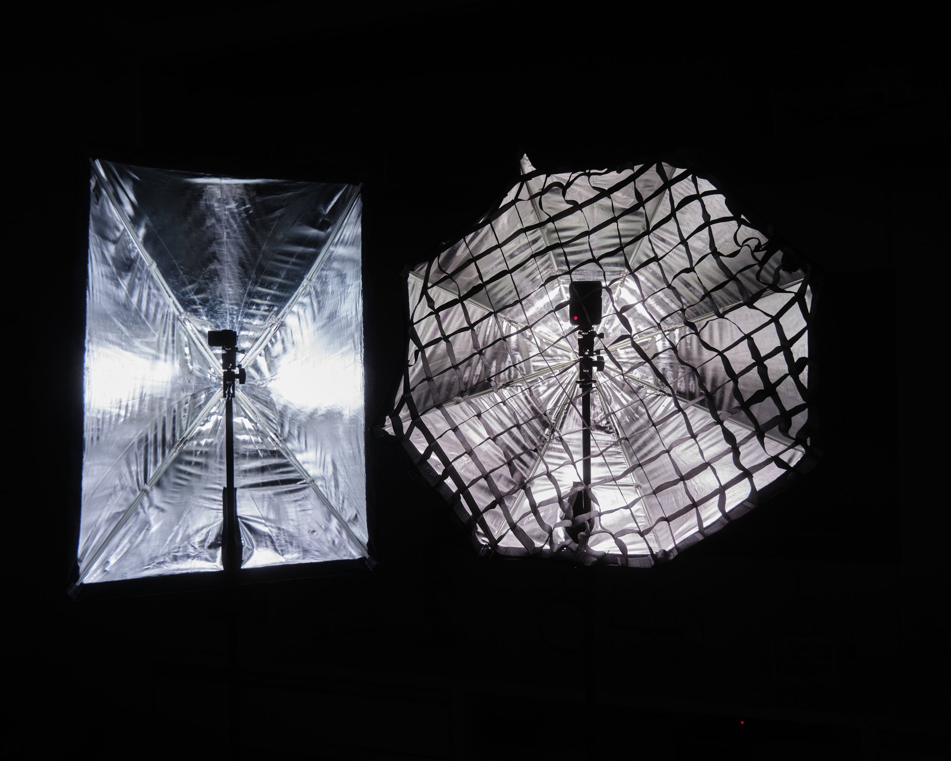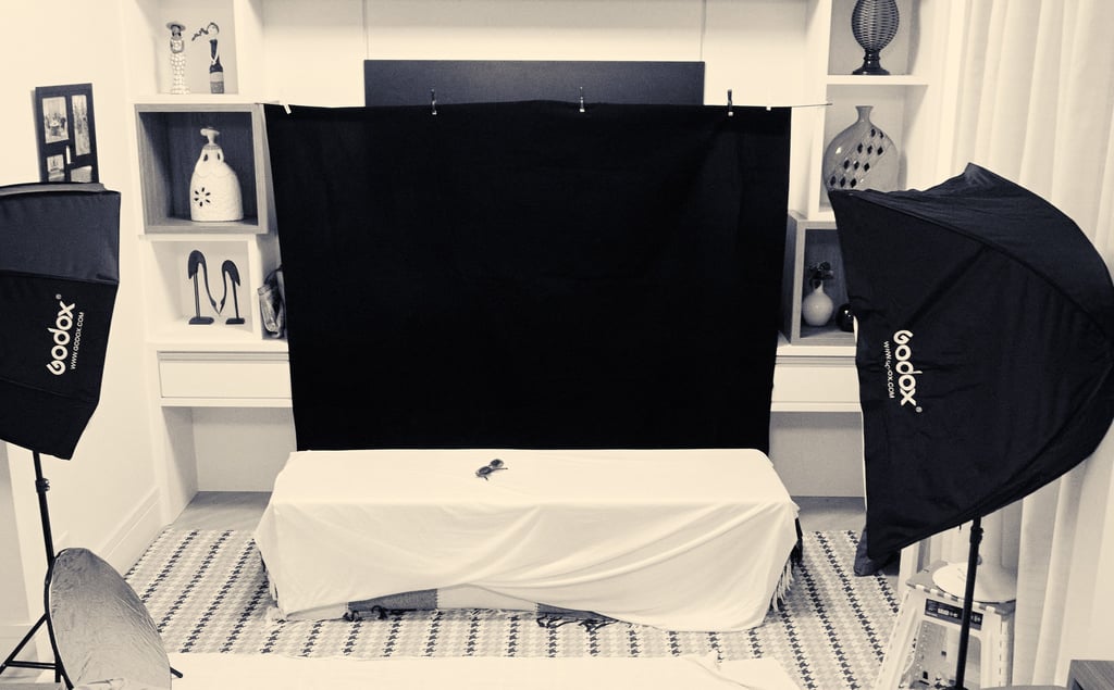 Uso sistema de iluminação artificial com dois softbox (aquilo que lembra guarda-chuvas) para iluminação suave ou dura do corpo da pessoa, fundos escuros e claros, flashs acionados a distância, rebatedores, entre outros.